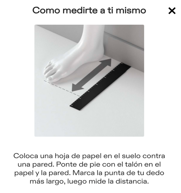 Coloca el pie sobre una superficie plana y mide su longitud con una cinta métrica, desde el talón hasta el dedo más largo. Repite el mismo procedimiento con ambos pies, ya que la forma, las proporciones y la longitud pueden variar ligeramente entre ellos, y elige la talla según la medida del pie más largo.